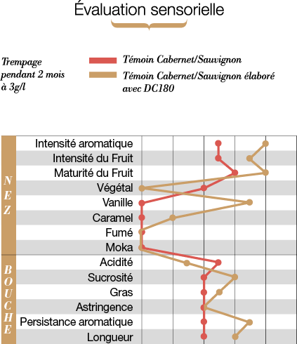 Utilisé entre la fermentation alcoolique et malolactique ou en élevage, « DC180 » modifie peu la structure du vin mais apporte surtout de la rondeur accentuée par les notes de vanille.