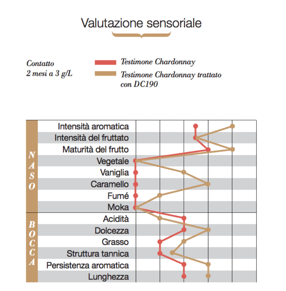 Utilizzato tra la fermentazione alcolica e la malolattica o in affinamento, «DC190» modifica poco la struttura tannica del vino ed apporta soprattutto morbidezza e «dolcezza».