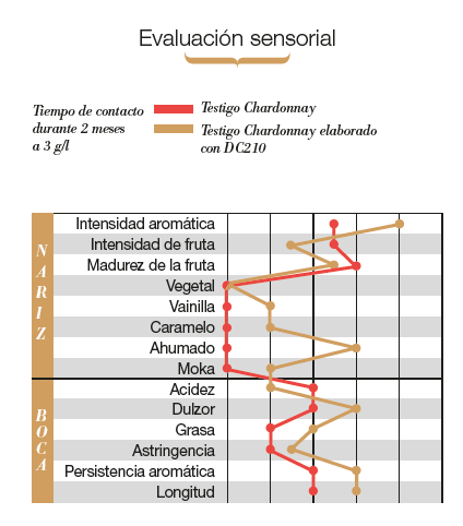 «DC210» está compuesto por maderas enológicas tostadas según un proceso específico. Aumenta la intensidad aromática de los vinos, y aporta, gracias al tostado, notas de ahumado y tostadas. Utilizado entre las fermentaciones alcohólica y maloláctica, o durante la crianza, «DC210» modifica poco la estructura del vino pero aporta principalmente redondez.